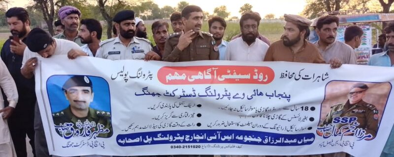 ایس ایس پی پٹرولنگ ہائی وے پولیس فیصل آباد ریجن مرزا انجم کمال صاحب اور ڈی ایس پی مظہر فاروق صاحب پی ایچ پی ڈسٹرکٹ جھنگ کے حکم پر، انچارج پٹرولنگ پولیس پل اصحابہ میاں عبد الرزاق جنجوعہ کی زیرنگرانی گزشتہ روز روڈ سیفٹی آگاہی مہم کا انعقاد کیا گیا۔
