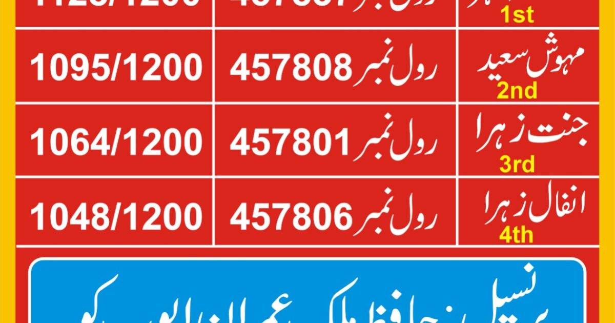 اٹھارہ ہزاری ،حافظ ملک عمران ایوب پرنسپل نائب پرنسپل لیاقت علی جنجوعہ شاہین پبلک سکول اٹھارہ ہزاری کی طالبہ نے تحصیل بھر میں اول پوزیشن حاصل کر کے والدین اور اساتزہ کا نام روشن کیا معصومہ زہرا مہوش سعید جنت زہرا انفال زہرا نے اچھے نمبر حاصل کرکے اول پوزیشن حاصل کی-