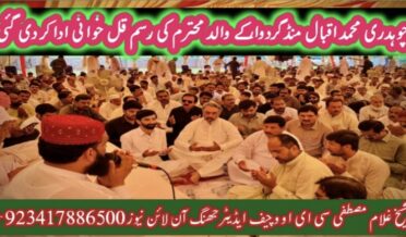 وریام والا شورکوٹ (شیخ غلام مصطفٰی) چوہدری محمد اقبال منڈ گردوار کے والد محترم کی رسم قل خوانی آبائی چک نمبر 493 باٹیانوالہ میں ادا کر دی گئی، جاوید اقبال چدھڑ ایس پی موٹروے، نواب بابر علی خان سیال ،میاں قمر حیات کاٹھیا، بہادر علی جھگڑ، راؤ اورنگ زیب ایس ایچ او ،زاہد عباس انسپکٹر ،اظہر خان بلوچ ایس ایچ او سمیت سیاسی و سماجی شخصیات سمیت محکمہ مال کے افسران /صحافیوں /وکلاء سمیت کثیر تعداد میں معززین علاقہ کی شرکت، رپورٹ محمد ریاض موہانہ بیورچیف جھنگ آن لائن نیوز